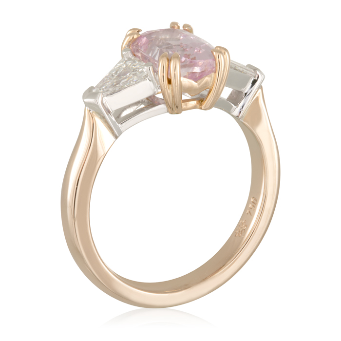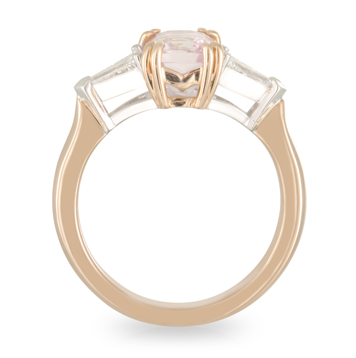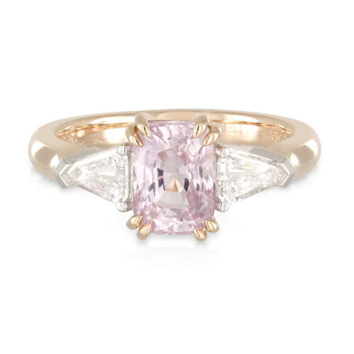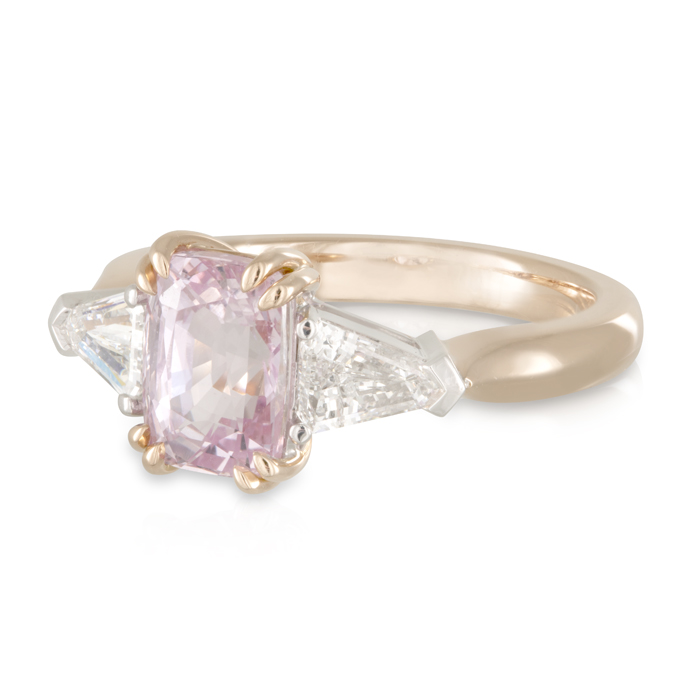 Cushion Cut 2.51ct Peach Sapphire and Bullet shoulder diamonds Engagement Ring.