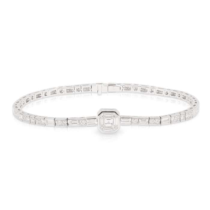 18ct White Gold 1.21ct Asscher Cut Diamond Bracelet with a line of Princess, Baguette and Round Brilliant Cut Diamonds Bezel Set. TDW 1.86ct.