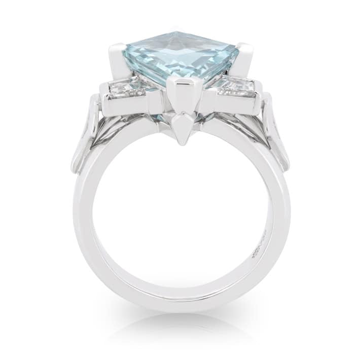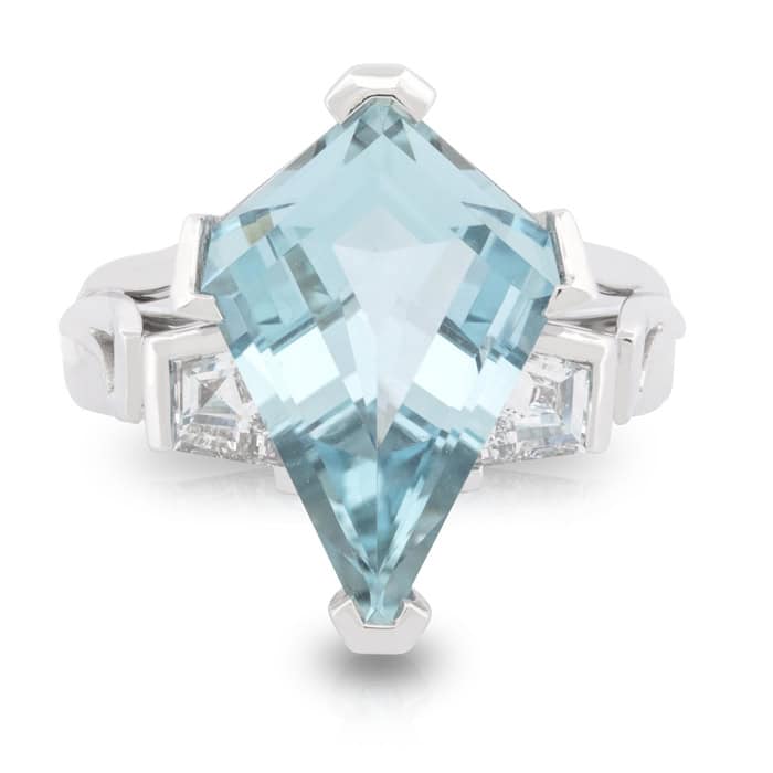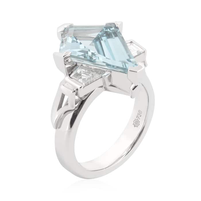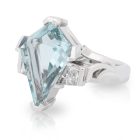 4.99ct Kite Shaped Aquamarine and Kite Shaped Diamonds Trilogy contemporary style Dress ring.