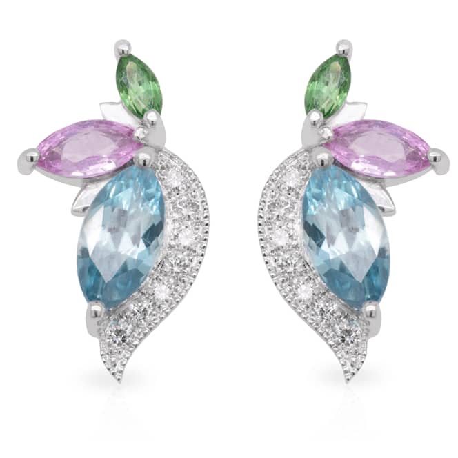 Angelique style Blue Zircon, Pink Sapphire, Tsavorite Garnet and Diamond Studs