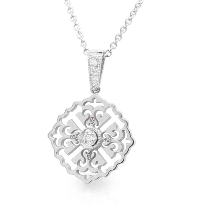 18ct White Gold Art Deco Crest with 0.12ct Round Brilliant Diamond Centre and Diamond Bale Pendant