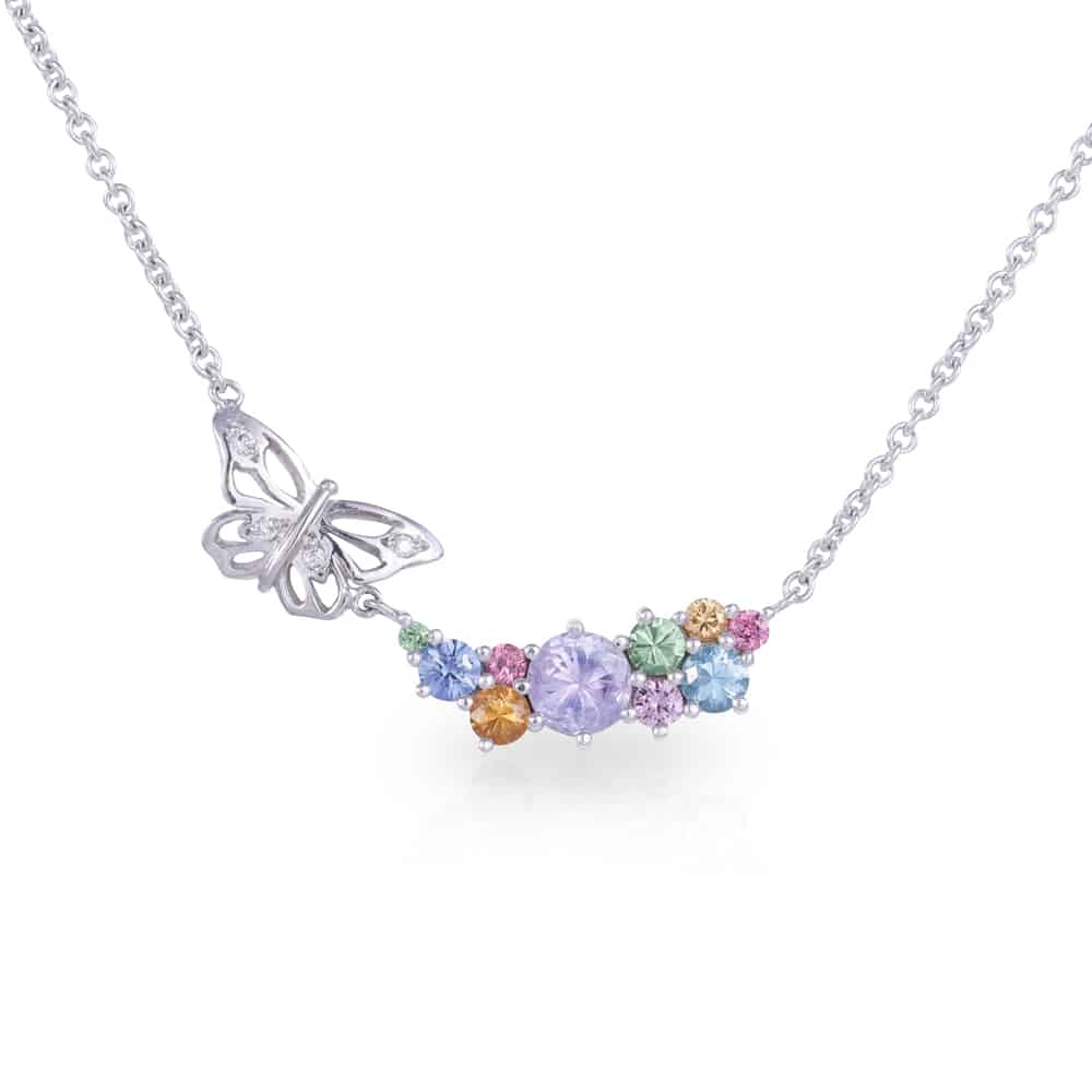 Borboleta Fruit Salad Pendant with Blue Sapphire, Tsavorite Garnet, Spinels, Mandarin Garnet, Zircon and Diamonds fixed on a trace chain.