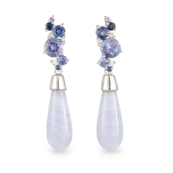 ‘Bubble’ Tanzanite, Ceylon Sapphire and Diamond Earrings with removable Lace Agate Drops.
