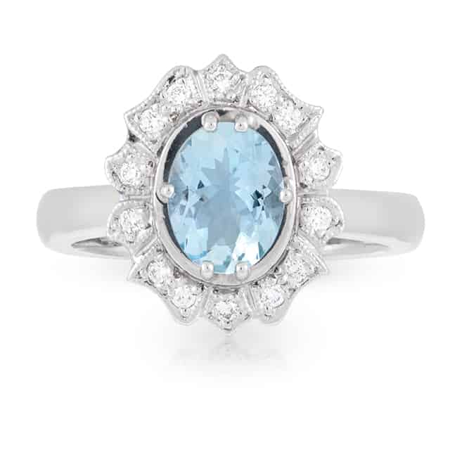 2.63ct Oval Aquamarine and Art Deco Diamond Halo Ring
