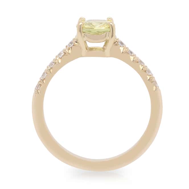 1.07ct Cushion Cut Yellow Sapphire and Diamond Shoulder Engagement Ring.