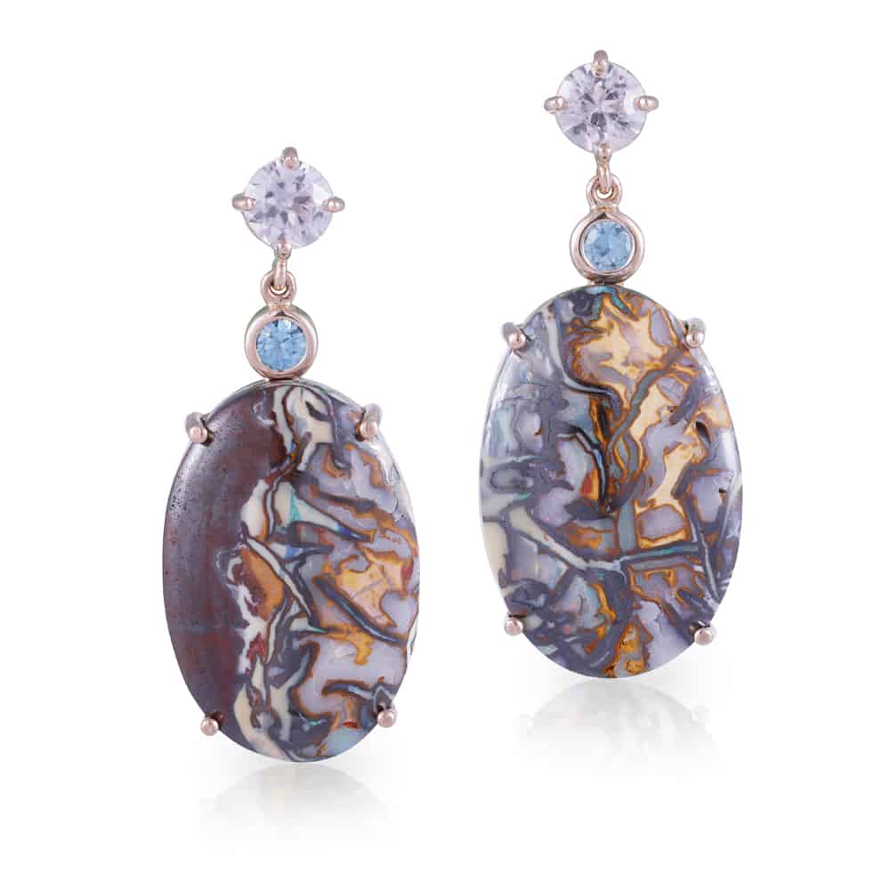 Morganite, Blue Zircon and Boulder Opal Drop Earrings