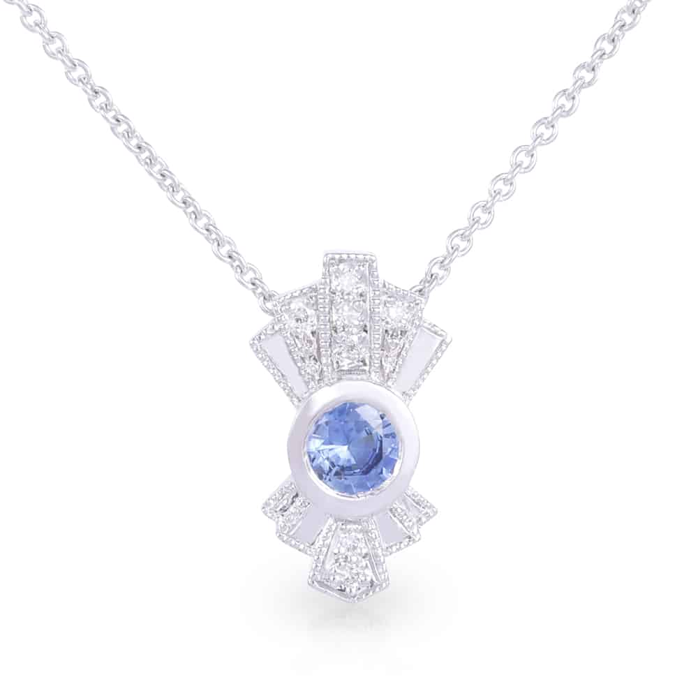 Hazel style Pendant with Blue Ceylon Sapphire and Diamond Halo on a Trace Chain