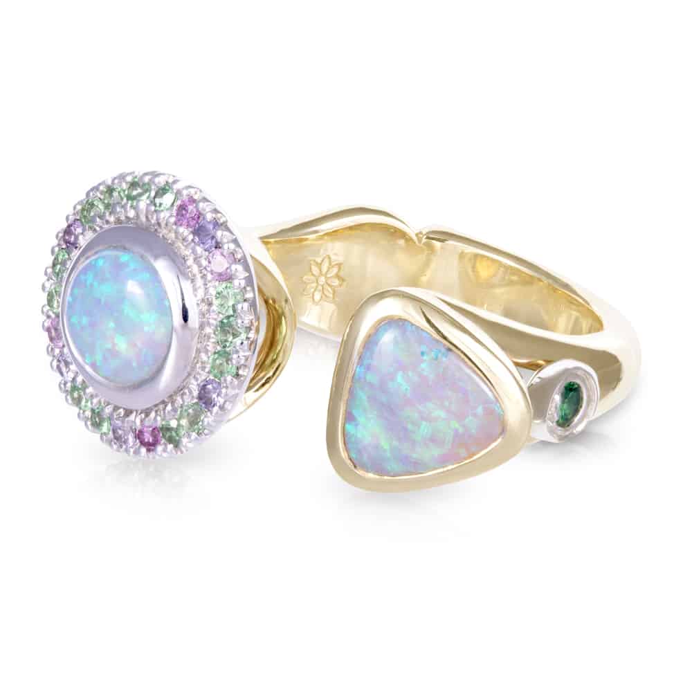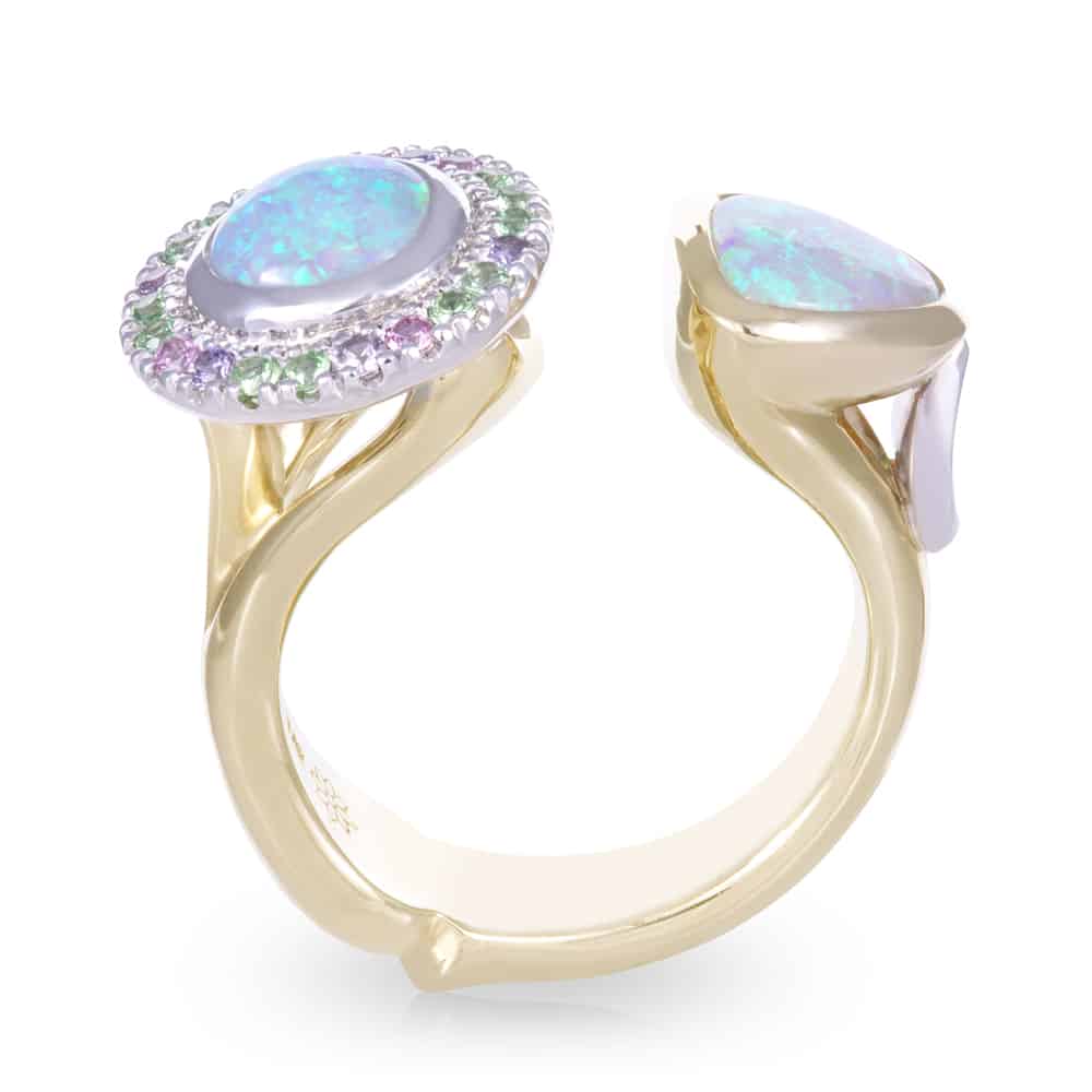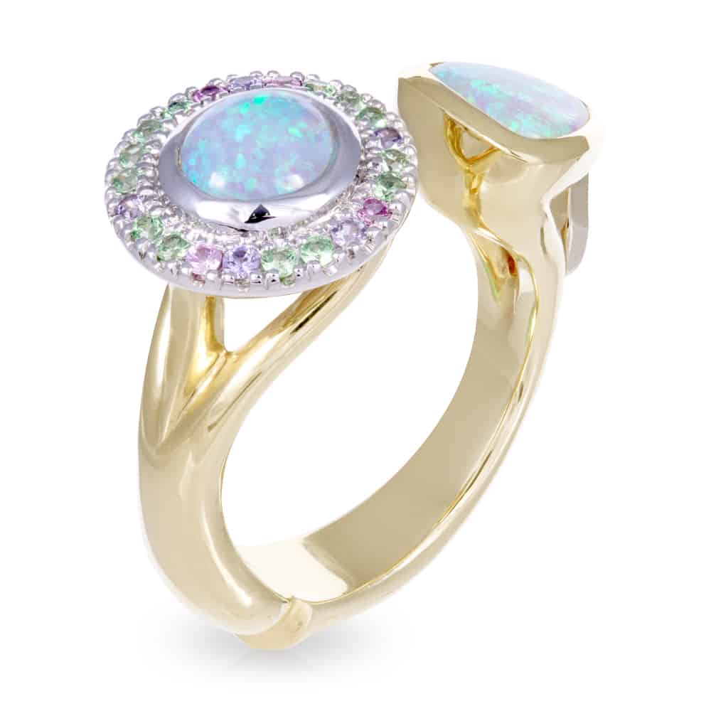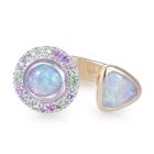 1.40ct Round Cabachon cut Opal, 1.50ct Trilliant Cabachon cut opal, Tsavorite Garnet, Pink/Purple Ceylon Sapphire Dress Ring.