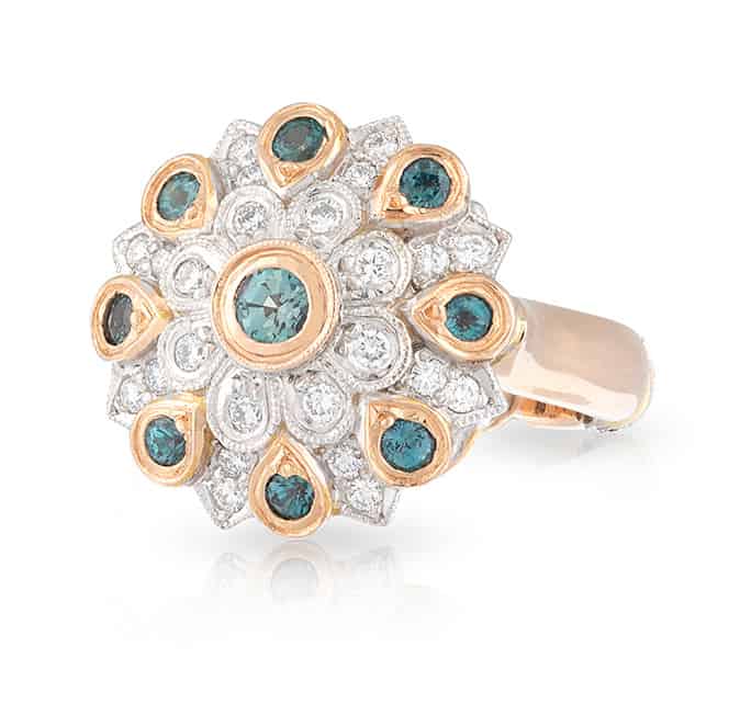 Alexandrite & Diamond Flower Dress Ring with intricate basket and shank details