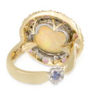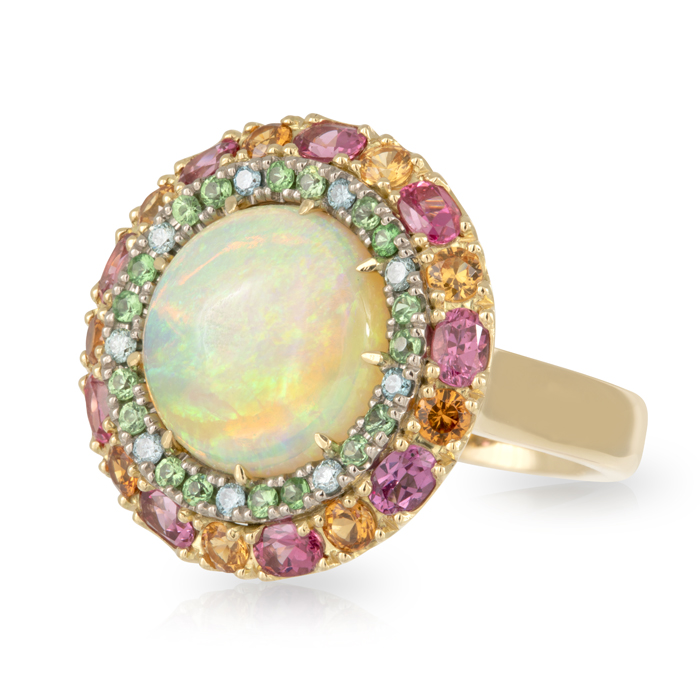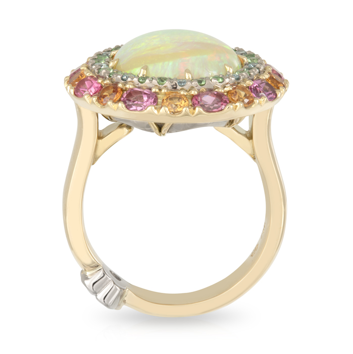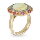 5.27ct Crystal Opal, Halo of Blue and Green Diamonds, Outer Halo of Pink Spinels/Mandarin Garnets and Tsavorite Garnets.