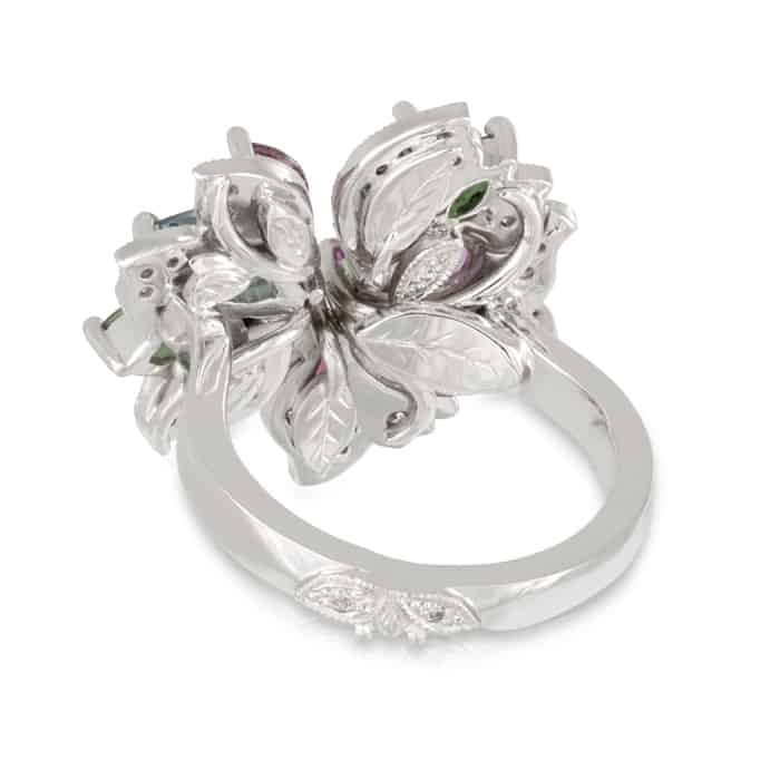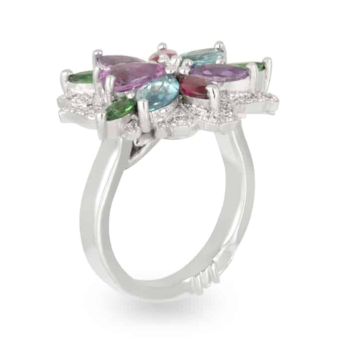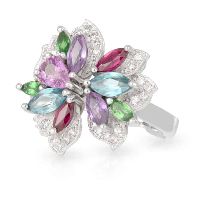 Blue Zircon, Rubellite, Pink/Purple Sapphires, Tsavorite Garnets and Diamond Cluster Ring
