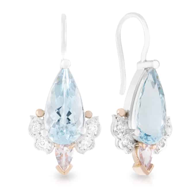 Pear shaped Aquamarine, Pink Ceylon Sapphires and Diamond Drop Earrings