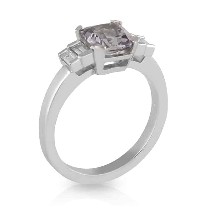 Enquire Now18t White Gold Asshcer Cut 1.80ct Mauve/Grey Spinel with Baguette Diamonds Shoulders Engagement Ring.