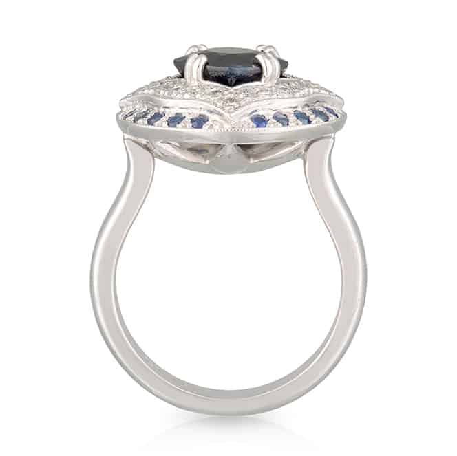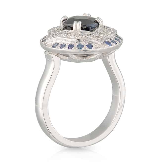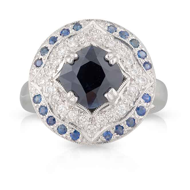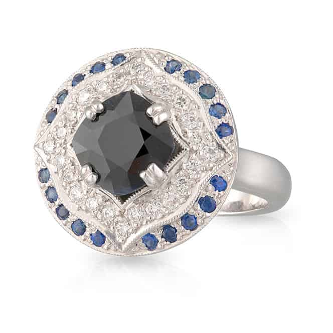 2.66ct Cushion Cut Black Australian Sapphire, Blue Ceylon Sapphire & Diamond Engagement Ring