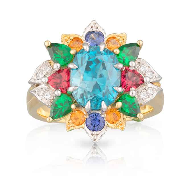 4.31ct Blue Zircon Fruit Salad Dress Ring with Pink Spinels, Tsavorite Garnets, Purple Sapphires, Orange Garnets and Diamonds