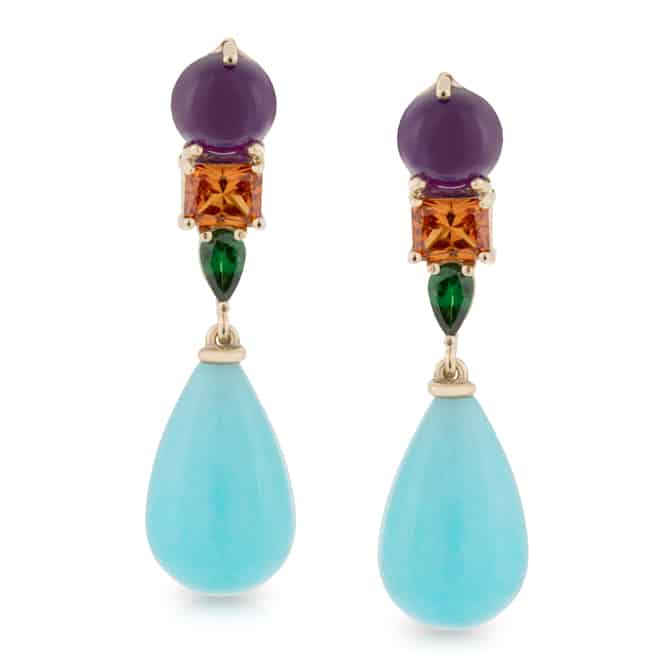 Cabachon cut Amethyst, Orange Sapphire, Tsavorite Garnet and Amazonite Drop Earrings