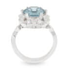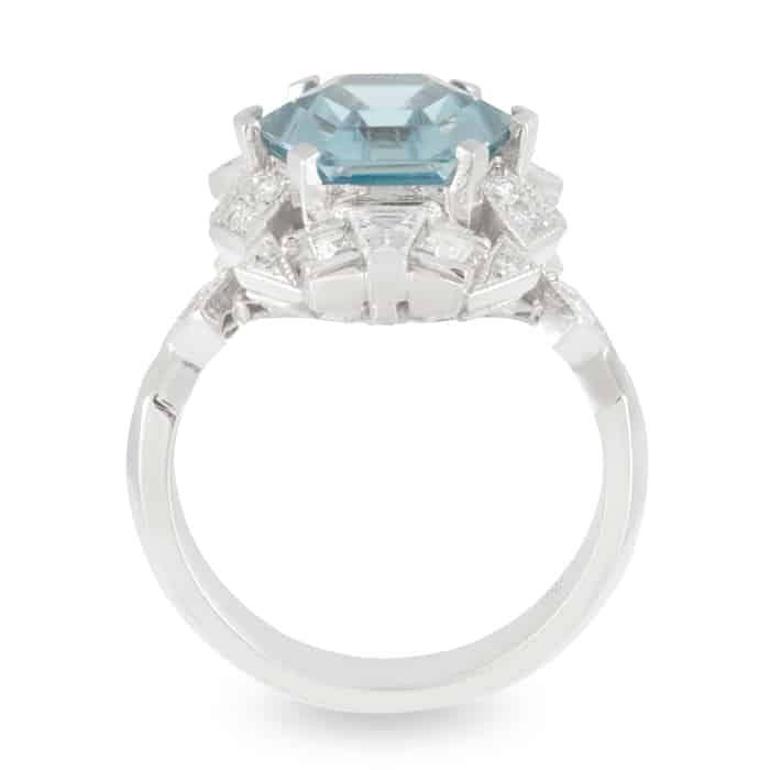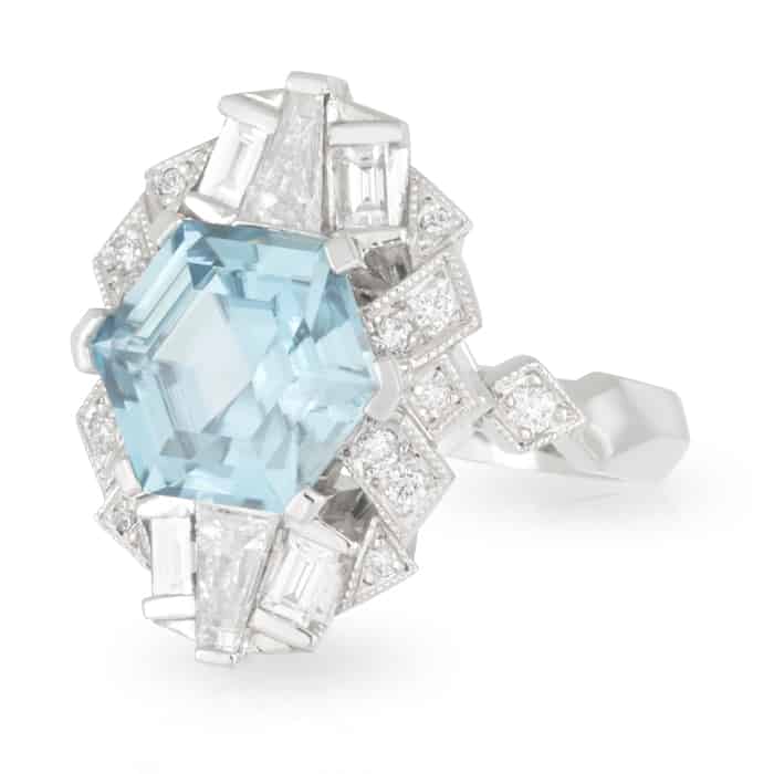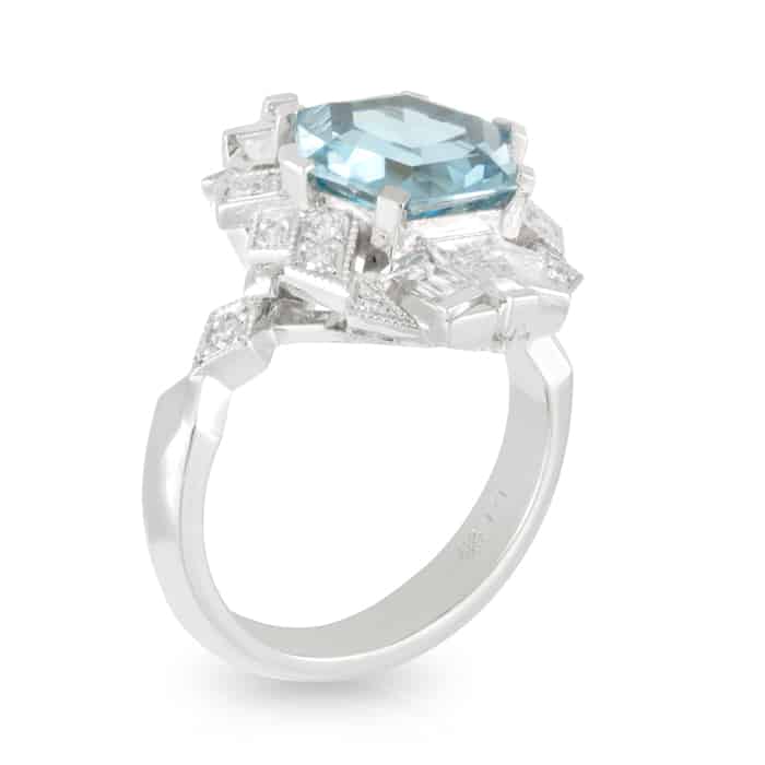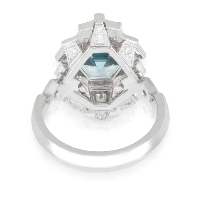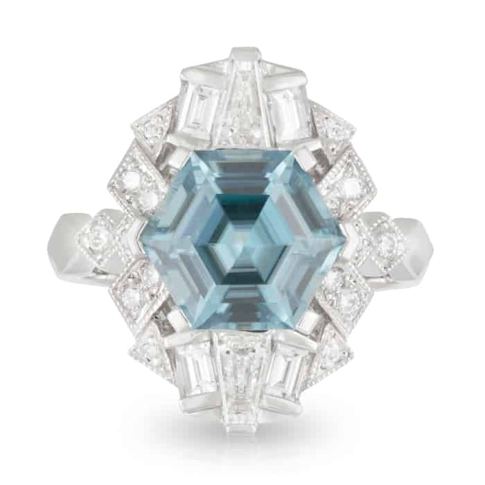 5.39ct Cambodian Hex shaped Blue Zircon and Geometric Diamond Dress Ring.