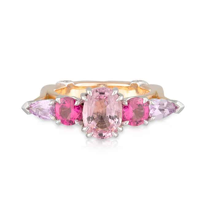 Oval 2.11ct Pink Spinel, Pink Tourmaline, Purple Sapphire & Diamond Dress Ring with intricate shank detail