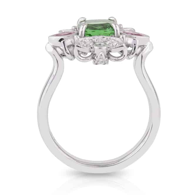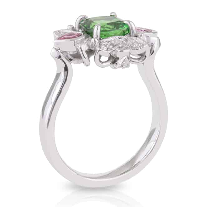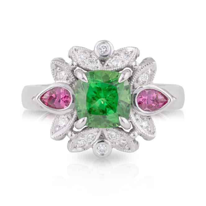 Cushion Cut 2.14ct Tsavorite Garnet, Pink Spinel and Diamond Ring